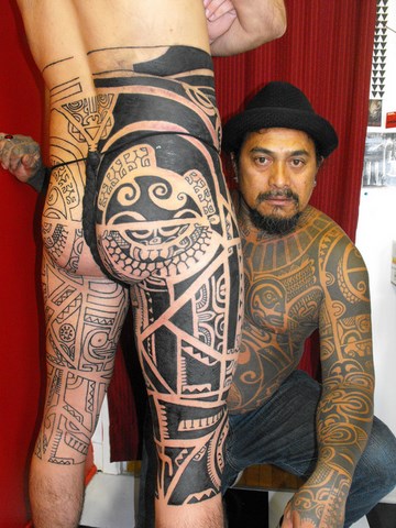 Roonui maître incontestable du tatouage polynésien , originaire des Tuamotu , grave sur les peaux