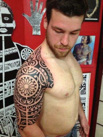 Roonui maître incontestable du tatouage polynésien , originaire des Tuamotu , grave sur les peaux